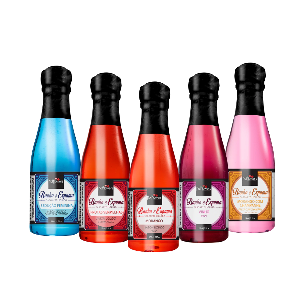 Sabonete banho & espuma. Os sabonetes líquidos unem dois aspectos deliciosos. Além de sabonete, são também, refrescantes banhos de espuma. A embalagem na forma de champanhe confere um clima ainda mais especial e prazeroso.